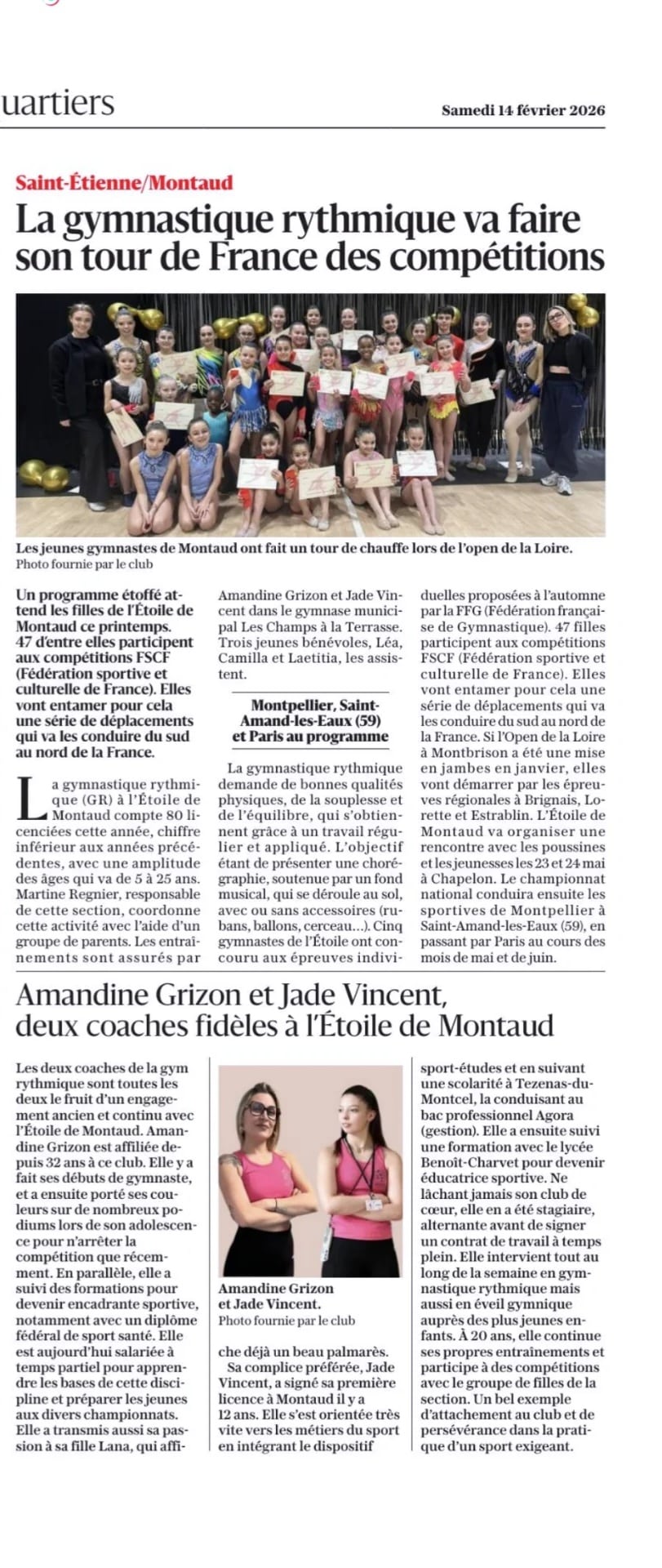 L’Etoile voyage cette année ! Posté par Admin | Fév 16, 2026 | Non classé | 0 | Ce Samedi 14 février 2026, un très bel article du journal a mis à l’honneur la section Gymnastique Rythmique de l’étoile de Montaud . Une magnifique mise en lumière pour les gymnastes et leurs coachs, récompensant leur travail et leur engagement.